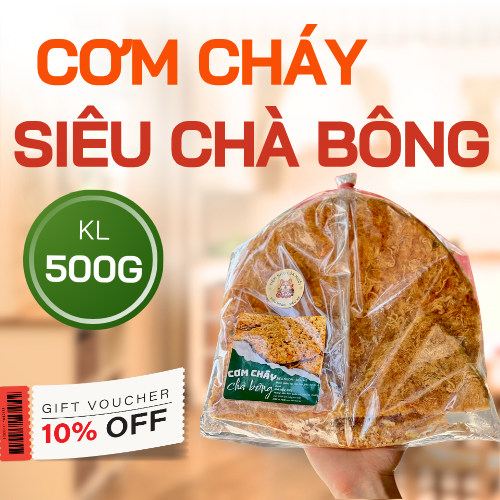 Cơm cháy đáy nồi siêu chà bông là sản phẩm hoàn hảo được kết hợp từ hai nguyên liệu đơn giản, thân thuộc của người Việt Nam.Cơm cháy được làm từ cơm nấu chín, sấy khô và chiên giòn, mang đến độ giòn tan hoàn hảo. Chà bông được làm từ thịt heo tươi ngon, xé nhỏ và sấy khô, tạo nên hương vị thơm ngon đặc trưng cho món ăn.